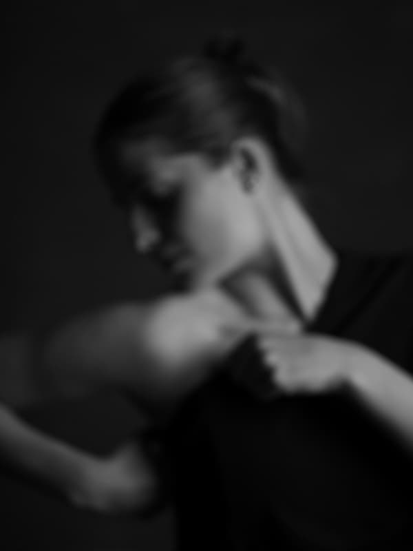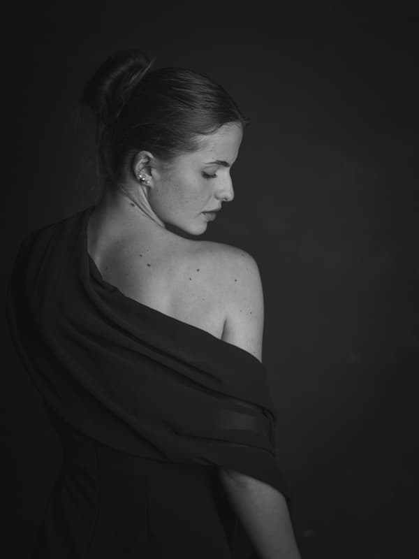 The exposed shoulder and elegant drapery create a timeless, almost classical feel within our contemporary experimental setting. Moments like this remind us why portrait workshops are so valuable: they allow space for vulnerability and discovery, turning a simple turn of the body into a profound visual statement about presence and introspection.