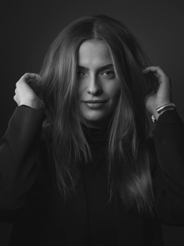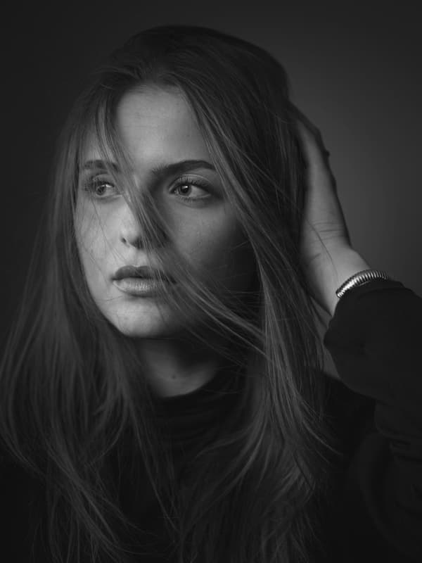 As the session settled, Estelle’s playful spirit found a new rhythm. Strands of her long hair fell like a veil across one eye while her fingers gently pushed them aside, revealing a gaze that was both curious and knowing. The soft studio lighting wrapped around her features, highlighting the natural glow of her skin and the subtle smile playing at her lips.