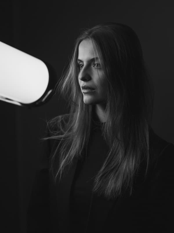 The tube became more than equipment; it became a collaborator, revealing the sculptural beauty of her features and the quiet confidence she carries even when the setup changes around her. Working with such specialized light sources pushed everyone’s creativity, and Estelle’s willingness to explore made the results even more compelling and unique. The stark contrast between the tubular light and the deep shadows created dramatic sculptural effects, highlighting how light can redefine a familiar face and bring out unexpected dimensions of character.