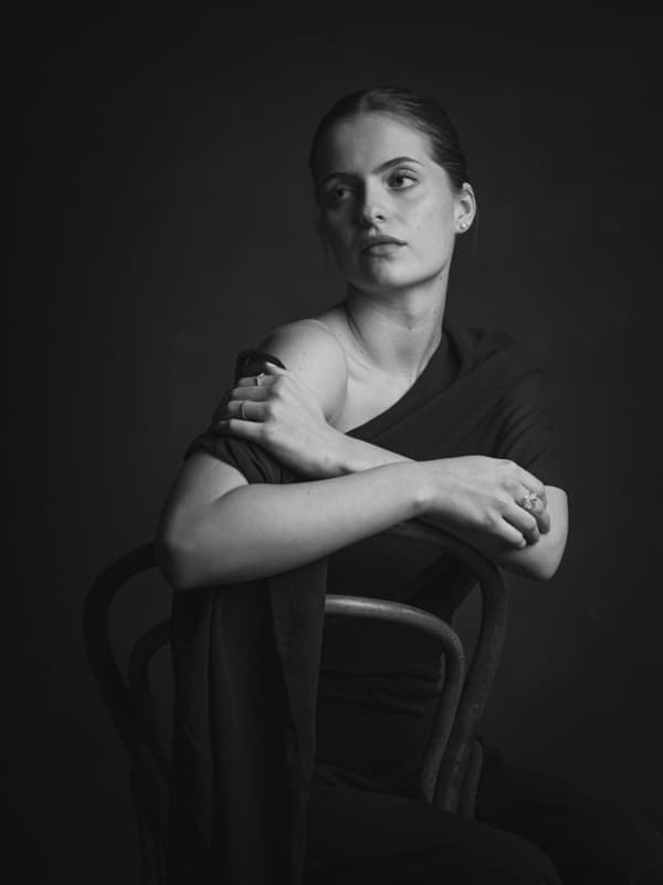 This image beautifully bridges the raw motion of the opening shot with the more composed portraits that follow, showing how effortlessly she transitions between states of being. The workshop participants exchanged quiet nods of appreciation, recognizing how her natural expressiveness made every frame feel alive and authentic. In these early moments, it became clear that Estelle was not just a model, but a true co-creator in shaping the visual narrative of the day.