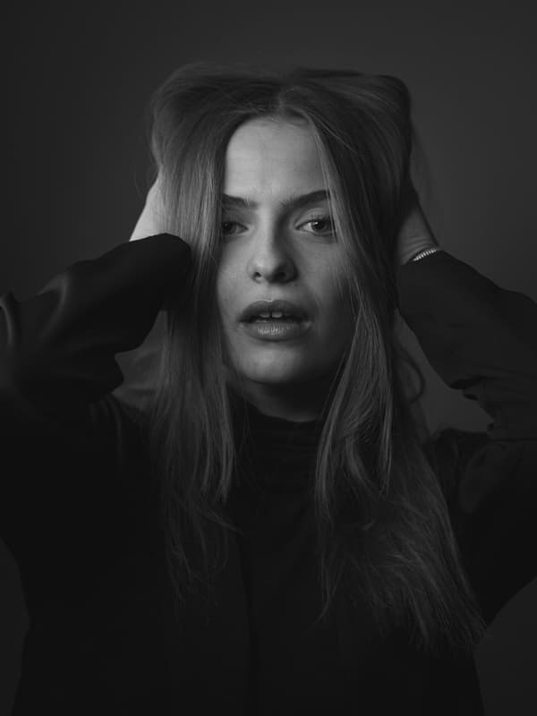 The series reached its emotional crescendo with Estelle’s hands framing her face, fingers buried in her hair, mouth slightly open as if on the verge of speaking. Her eyes locked onto the viewer with unapologetic intensity, the culmination of every emotion explored throughout the workshop.
